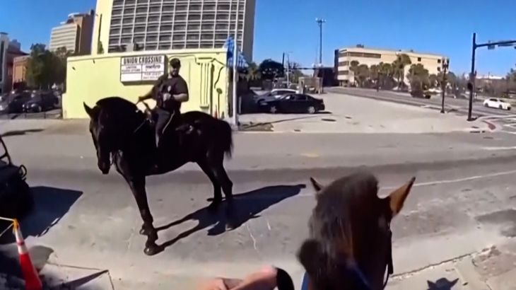 ‘Get that bad man.’ Newly-released bodycam video shows police on horseback in Jacksonville, Florida chasing a suspected drug dealer on foot for around 500 metres before they could apprehend him.